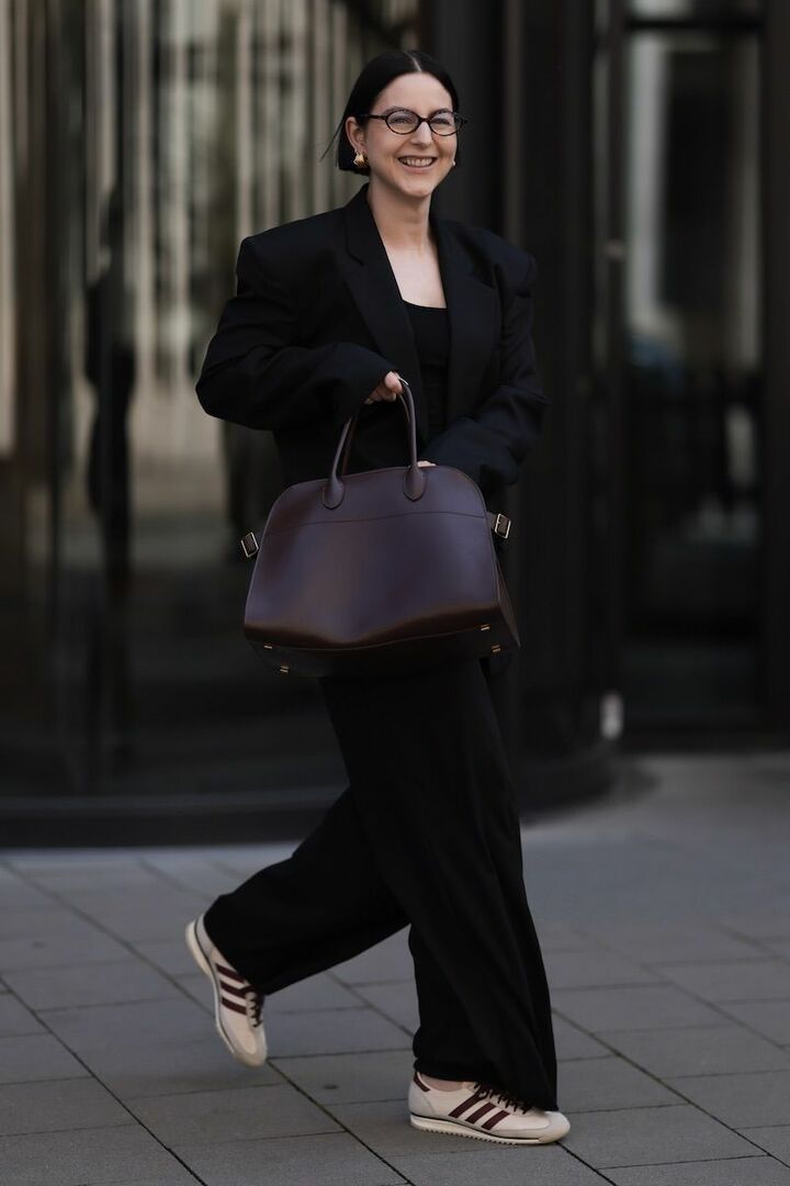 ジャケットとパンツの黒セットアップは、オーバーシルエットに更新して緊張感を和らげながらオフの日にも活用できるように。凛とした黒の装いには、バーガンディのマットなレザーバッグがよく似合います。スニーカーを効かせ、足元だけカジュアルにすると簡単にあか抜けが実現。バッグと同じ色のサイドストライプが好アクセント。