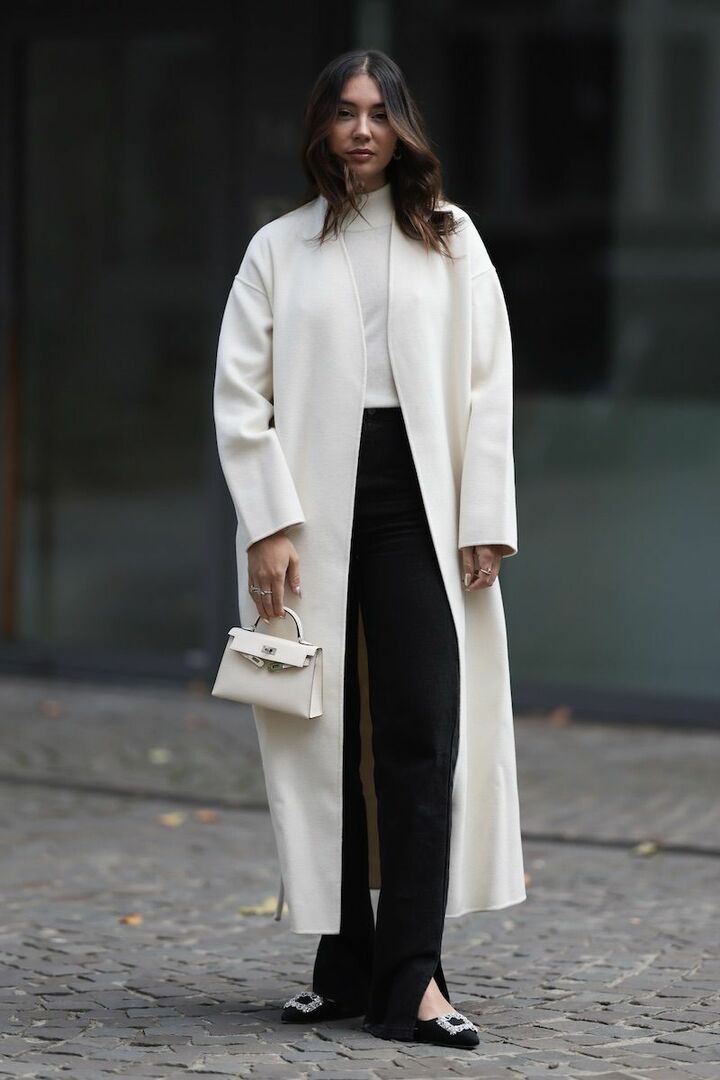 定番の白黒コーディネートがすらっと見える、落ち感のあるIラインノーカラーコートとパンツの組み合わせ。パンツにスリットが入っているから、キャッチーなビジューパンプスを取り入れて華やかさをトッピング。