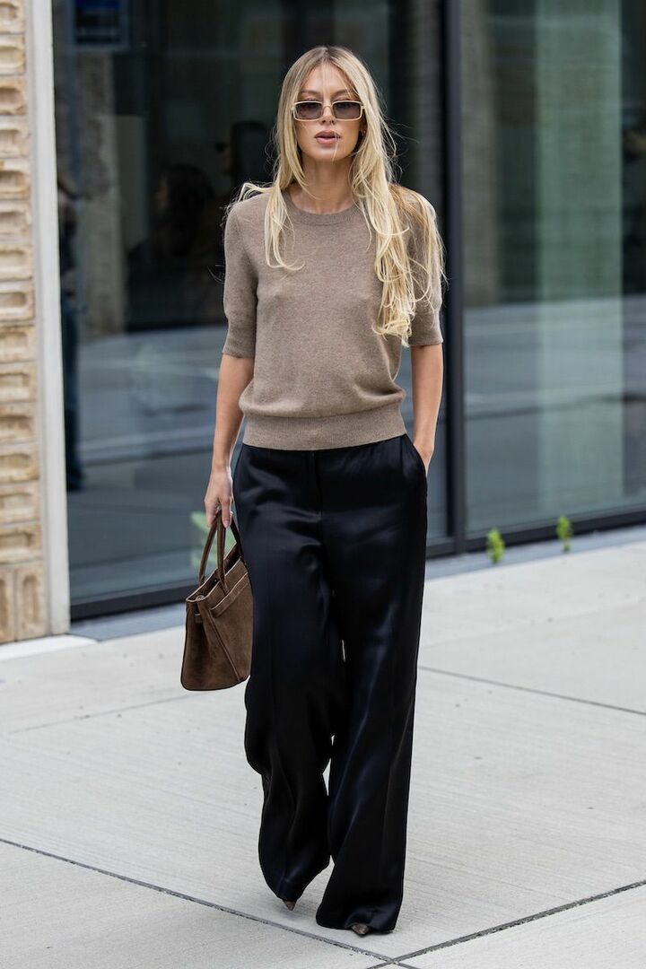 トップスとパンツのシンプルなコーディネートでも様になるよう、ツヤ素材のパンツを立体感に繋げて。深みのあるベージュのニットプルオーバー、温かみを感じるブラウンのスエードバッグを掛け合わせ、秋らしいぬくもりを表現。