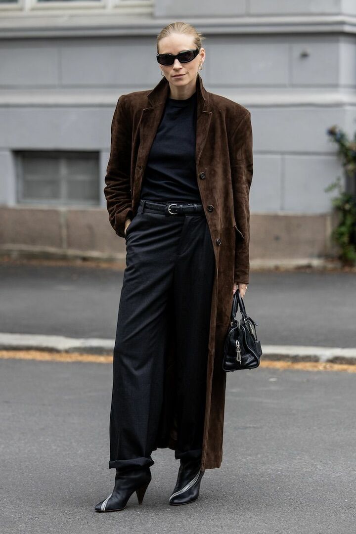 冬のブラックコーディネートが無難にならないよう、ベルトでトップスとパンツの境界線を明確にしつつ、ブーツのモードなコーンヒールをアイキャッチに。黒のシックな印象を損なわないビターブラウンスエードコートがプラスの効果を発揮して、奥行きが出現。