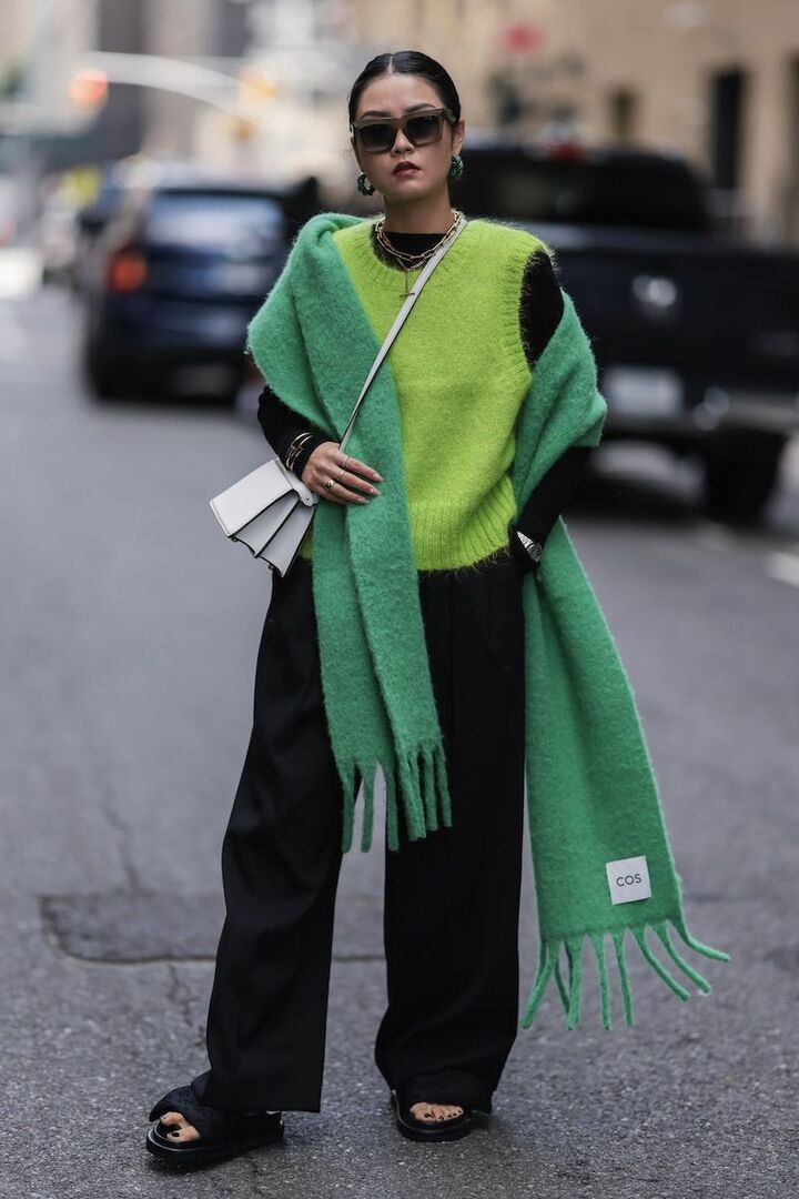 オフの日には、鮮やかな黄緑のニットベストと緑のストールを重ね好奇心を刺激。ポップに傾きすぎないのは、ほかのアイテムを黒で構成しているから。またワイドパンツとアッパーにボリュームのあるサンダルを使って重厚感を宿したことで、インパクトのあるカラーブロックと釣り合いを取ることに成功。