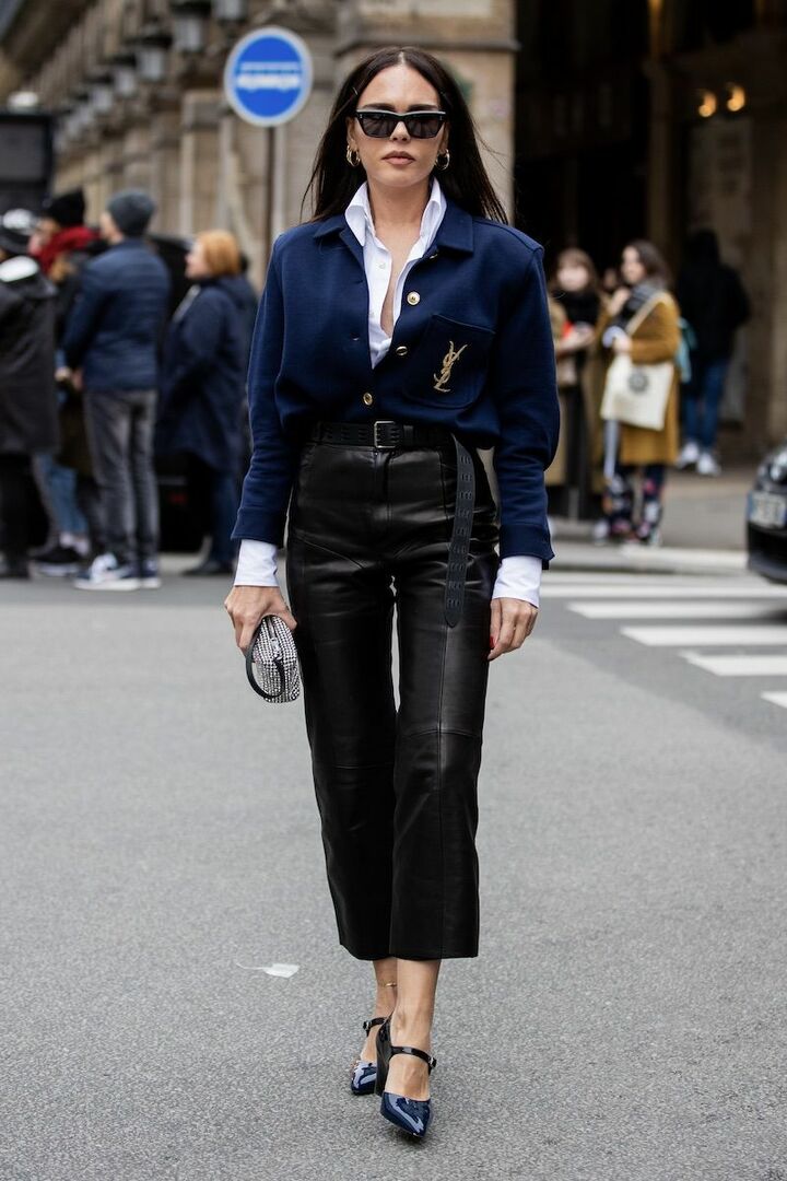 秋らしいノーブルなムードが漂う、ネイビーと黒を基調としたコーディネート。お洒落心を満たすために、ぴりっとスパイシーなレザーパンツをチョイス。白のシャツと肌見せがメリハリを叶え、リズミカルに着地。