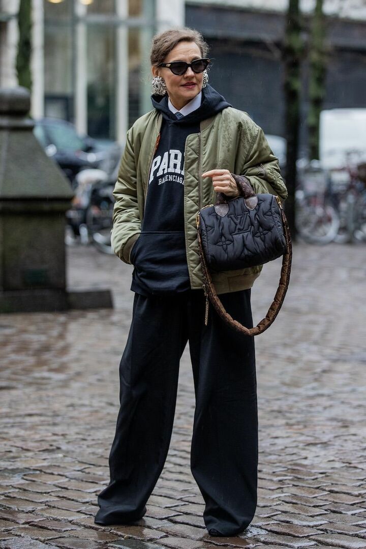 シャカシャカ素材のパファージャケットとカーゴパンツにこだわって、冬のブラックコーディネートをアクティブに誘導したエミリー・ラタコウスキー。トップグレーのスニーカーが軽快さとスタイリッシュさを実現してくれます。視線を奪う、鮮やかな赤のボストンバッグをアイキャッチに。