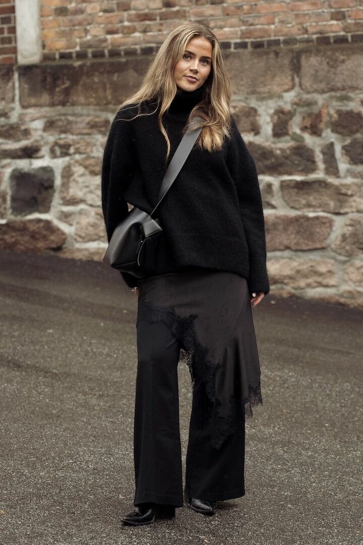 オールブラックコーディネートは、アレンジしやすいようにタートルニットとパンツをベースに。ツヤたっぷりのバッグを投入して奥行きを宿したら、さらに微光沢感のあるレーススカートを忍ばせて動きをつけて。トレンド感も漂って一石二鳥。