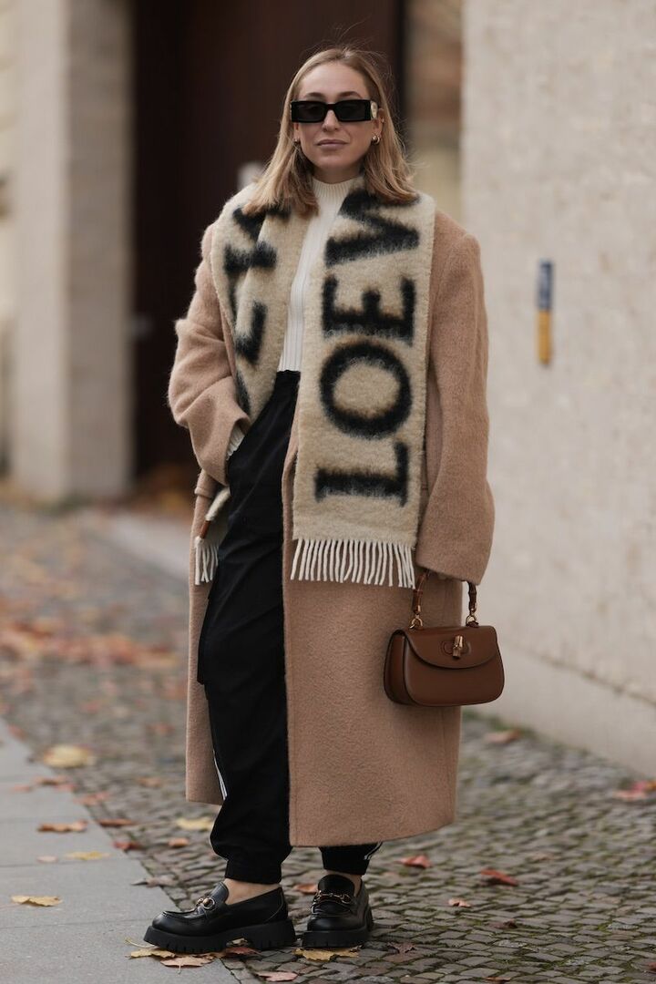 ベージュと白の柔らかな配色にマッチする、ゆったりとしたリラクシーなスウェットパンツ。黒を頼りにして引き締め効果を加え、ルーズになるのを防止。ビッグロゴが目を引くストールをラフに垂らせば立体感が倍増します。