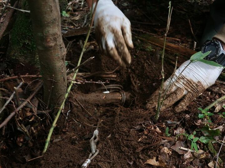 くくり罠を実際に仕掛けているところ。罠だとばれないように細心の注意を払う
