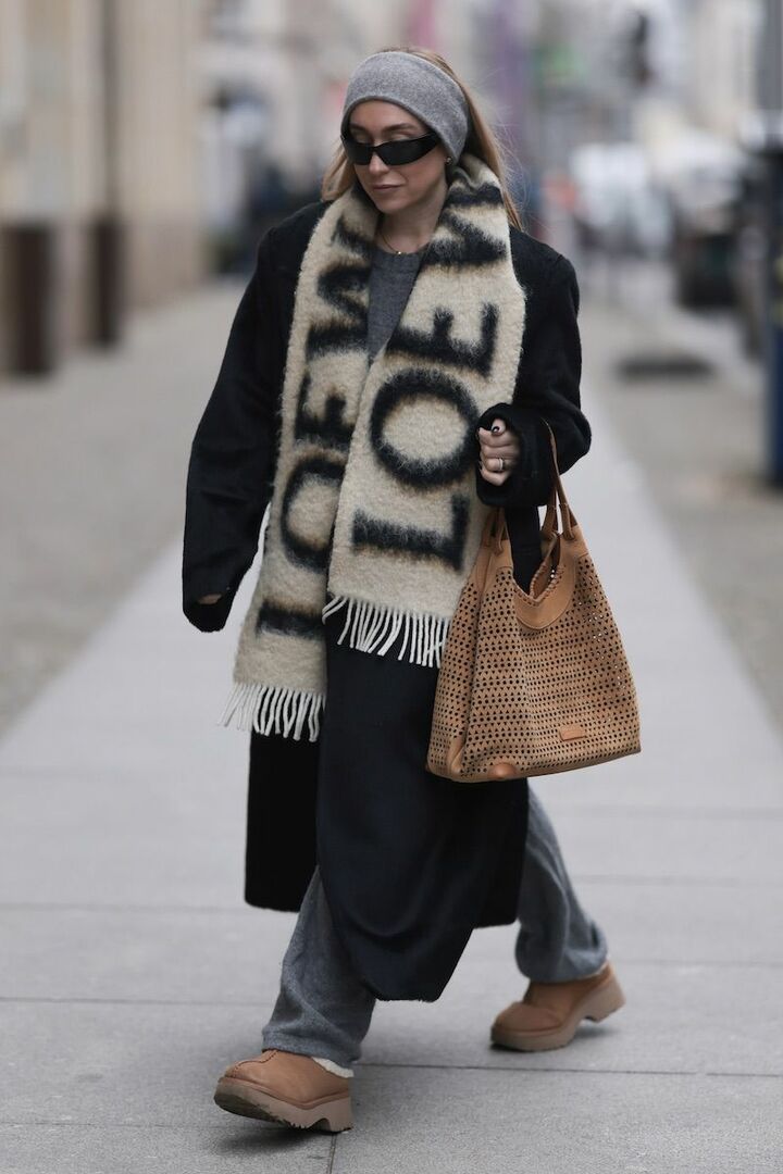 冬コートにプラスして、防寒小物があると安心です。グレーで繋いだニットプルオーバーとパンツに、黒コートを重ねてモノトーンスタイルへ。そこにフリンジマフラーとムートンブーツを投入すると温感が宿ります。ヘアバンドで耳元もカバーしながら、額を見せることでアクティブに誘導。