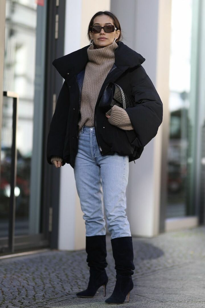 最高気温8度の日は、ダウンなど中綿入りのアウターが重宝します。黒のダウンジャケットなら、色合わせもしやすくアレンジのしがいがあります。タートルネックニットとスエード素材のロングブーツを組み合わせ、ぬくもりを体現。