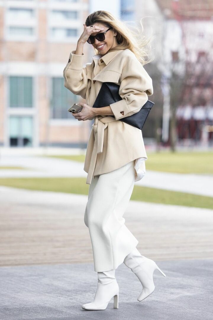 最高気温が18度前後まで上昇するので、スカートを使って気温にマッチする軽やかさを演出。気温が下がっても寒そうに見えないよう、ブーツを合わせモダンさを両立。まろやかなベージュのシャツジャケットに、白で統一したボトムコーデでキレよく見せながら春らしく。