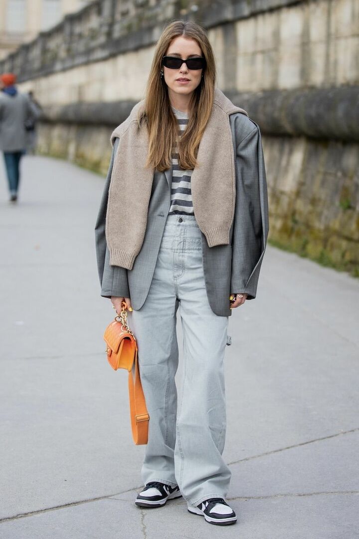 ボーダーカットソーとデニムパンツ、スニーカーのカジュアルスタイルを、ジャケットを使ってクラスアップ。オーバーサイズのジャケットを選ぶと、カジュアルアイテムに馴染ませることができます。これだけでもコーディネートは完結しますが、ニットをストール感覚で引っ掛けると立体感がアップ。寒いときには着用できるのが便利です。