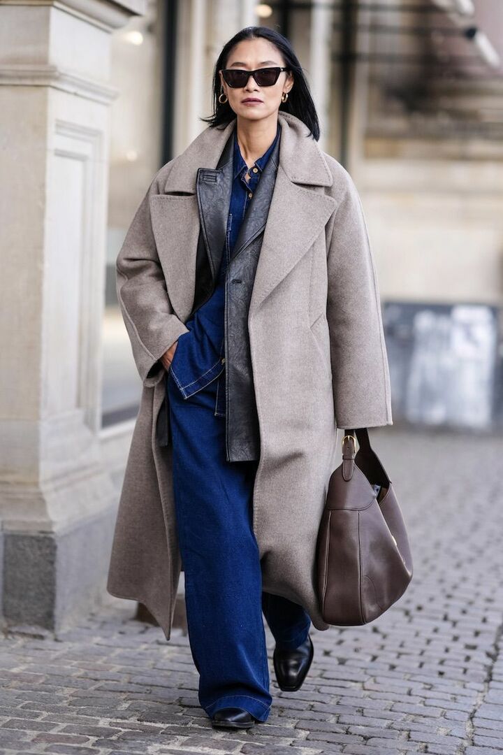 トップスとアウターだけでなく、アウターを重ね着すると調整できて便利です。デニムシャツ、レザージャケット、ウールロングコートという襟付きアイテムを3つ重ねれば、心地よいリズムが宿って上級者な面持ちに。シャツと揃いのパンツを合わせ、一体感をオン。