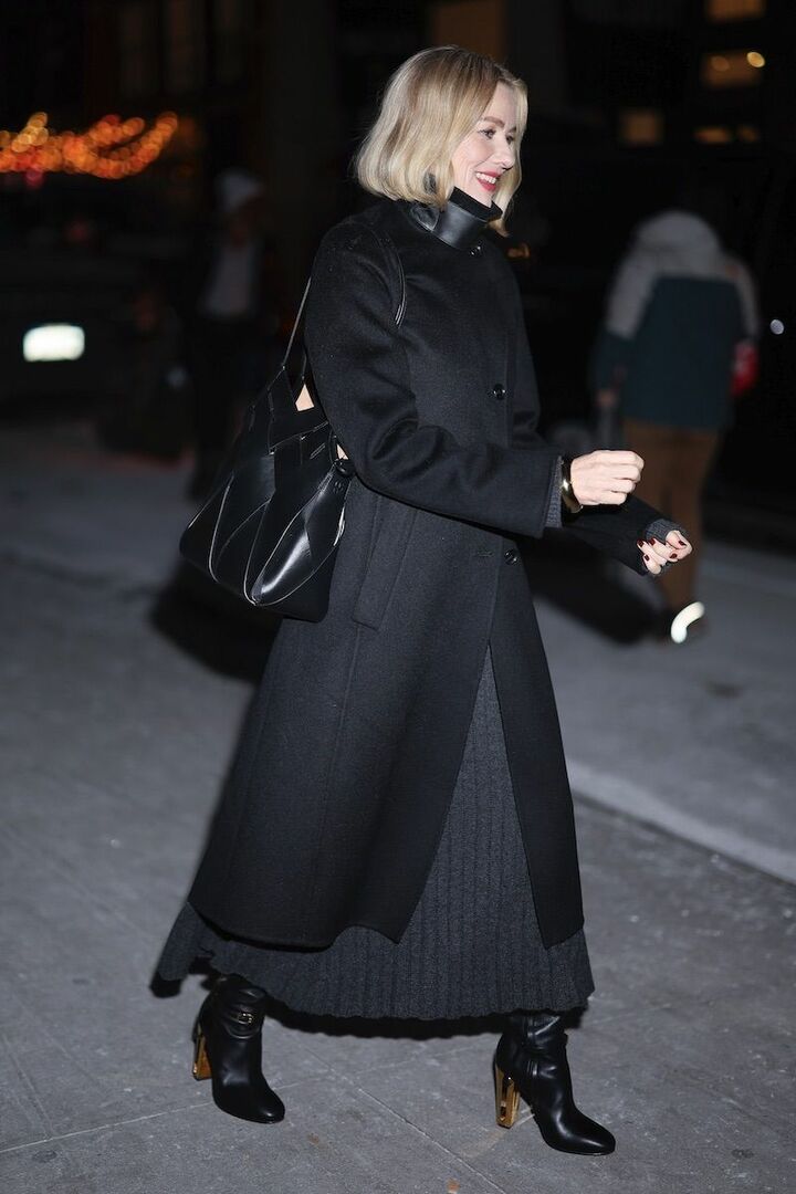 首元もしっかりカバーしたい最高気温8度の夜は、ハイネックコートを取り入れて防寒力をアップ。ナオミ・ワッツは襟のレザーバンドがモードな黒ウールロングコートに、チャコールグレーのニットプリーツスカート、黒ロングブーツを合わせ、お洒落しながらしっかりと防寒。