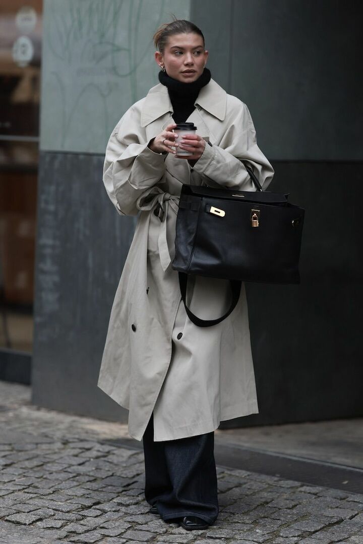 最低気温8度の日は、適度な防寒力を備えた定番のトレンチコートが活躍します。黒のオフタートルニットとインディゴブルーデニムパンツのワンツーに、ライトベージュのトレンチコートを重ねクラスアップを実行。