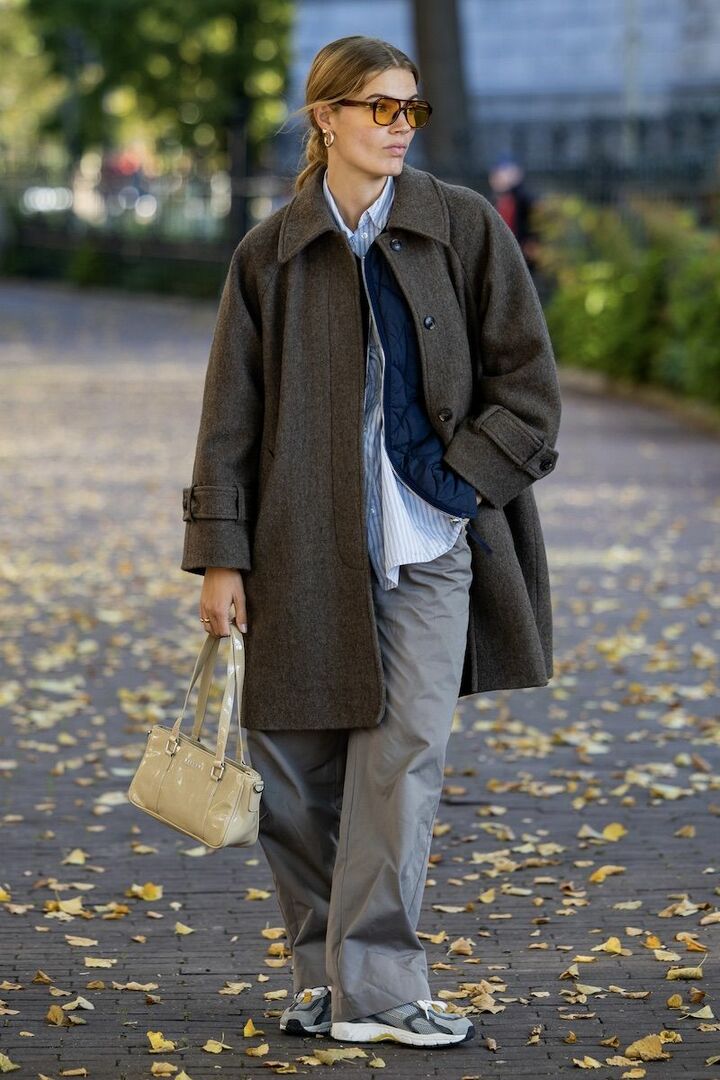 シャツとウールコートのあいだに着膨れしないライナーコートを忍ばせ、防寒力を底上げ。シャツのブルーストライプとライナーコートのキルティングが共鳴し、メリハリが高まります。パンツとスニーカーのシンプルな合わせ技でバランスを計算。