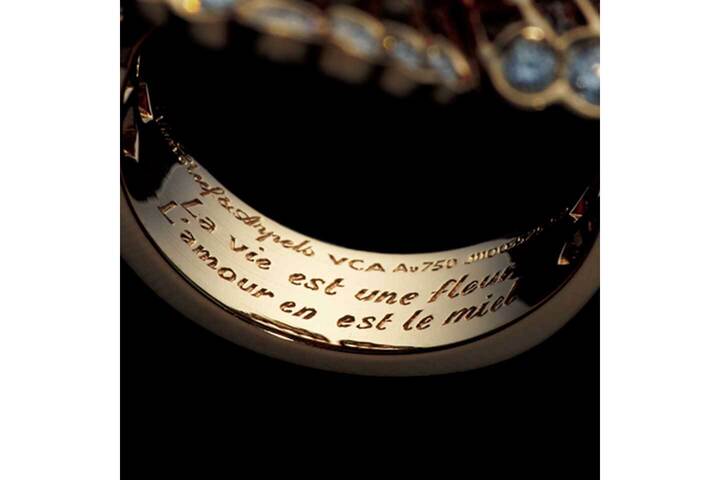 リングのアームの内側には、『レミゼラブル』などで知られる、フランスの小説家ヴィクトル・ユゴーによる有名な詩句「La vie est une fleur, L'amour en est le miel=人生は一輪の花、愛はその蜜」が、小さな文字で刻まれています。それは、身につける女性だけが知る、永遠の愛のメッセージなのです。
