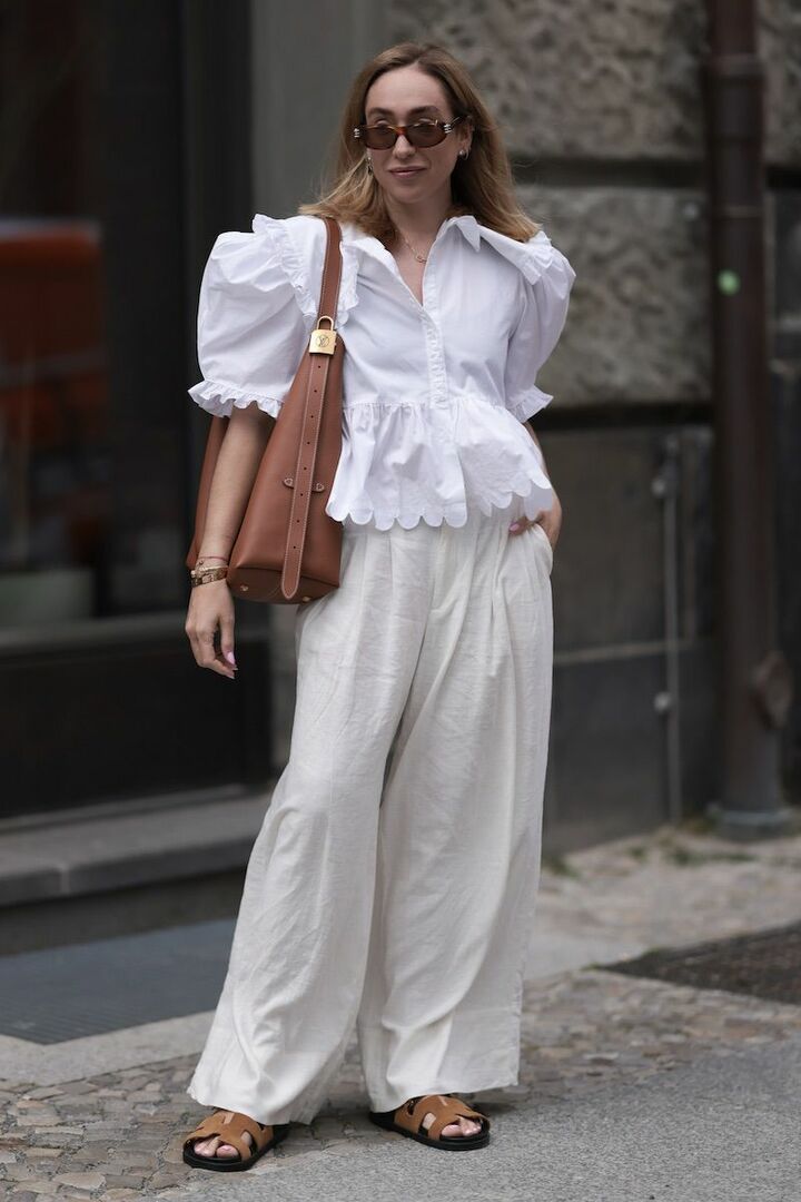 かさっとした風合いのワイドイージーパンツを合わせることで、ボリューム袖やスカラップレースがフェミニンなブラウスの糖度を中和。黒小物だとコントラストが付きすぎてしまうので、黒よりソフトなブラウンのバッグとサンダルで穏やかに引き締めると優雅さをキープできます。