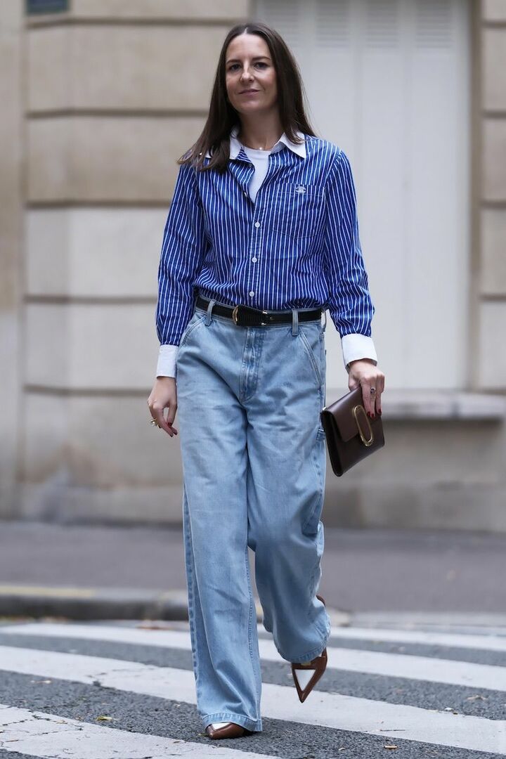 白Tシャツとライトブルーデニムパンツの王道カジュアルをベースにしたら、ブルーのストライプシャツを重ねて清潔感を後押し。黒のベルトとビターブラウンのクラッチバッグを取り入れ、程よいきちんと感を添えると大人らしいカジュアルが出来上がり。