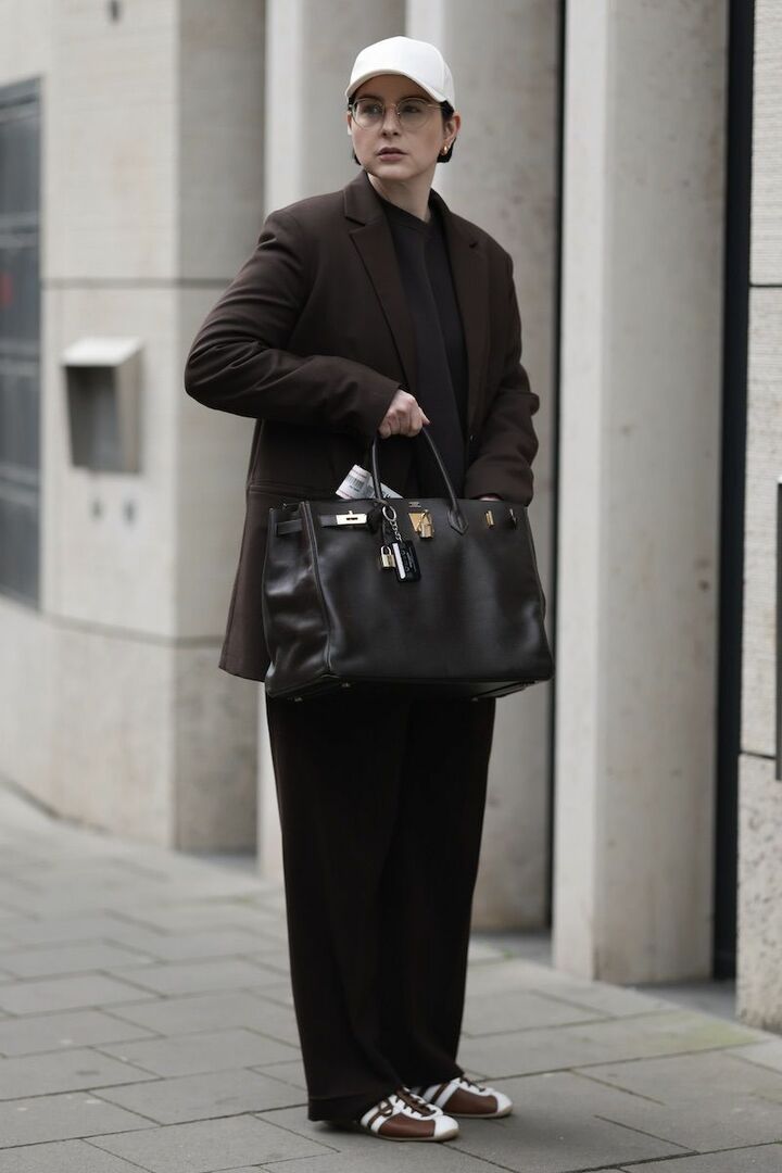 ジャケットとパンツのスーツは、深みのあるブラウンをセレクトすると格好よさがぐんとアップ。そこに濃く深みのあるダークブラウンのレザーバッグを合わせ、奥行きを演出。ぼんやりしがちなワンカラーコーディネートも、キャップとスニーカーを使って上下に真っ白を置くと切れ味がプラスされ、軽やかに仕上がります。