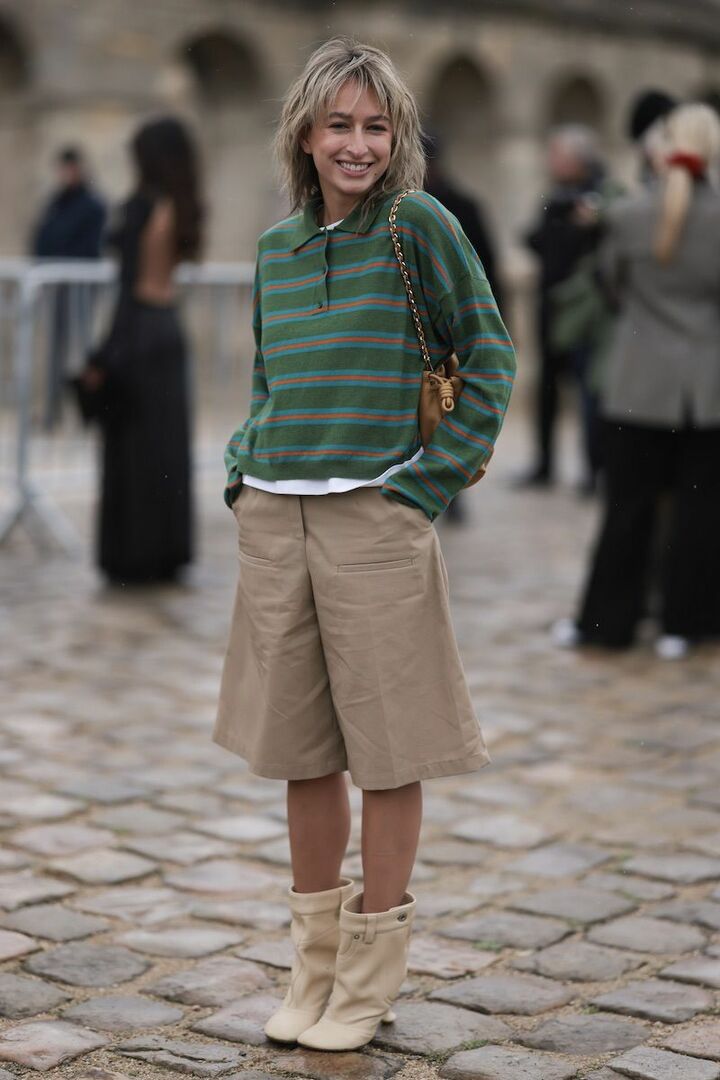 ボーダーポロシャツとハーフパンツを合わせたトムボーイルックは、グリーンとベージュという落ち着いた色合わせで幼さをセーブ。ブラウンのバッグで優しく引き締めつつ、ポロのインに白カットソーを仕込むとリズミカルに整います。足元には筒幅にゆとりのあるショートブーツを取り入れ、ほんのりモダンさをミックス。
