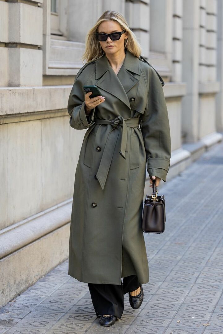 仕立てのよさを感じる深みグリーンのトレンチコートを、きゅっと共布ベルトでウエストマークしグラマラスに。ゆったりとした黒ワイドパンツとバレエシューズでエフォートレスな空気感を漂わせるとこなれ見え。ダークブラウンバッグでハンサムな配色にして、シックな着こなしをコンプリート。