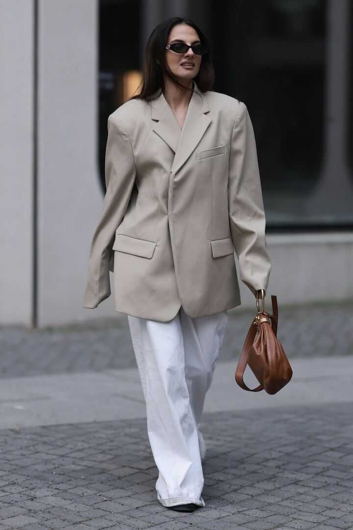 上品なベージュジャケットは、ボディラインをカバーするゆったりシルエットを採用して今っぽい空気感をまとって。手元には、ベージュと相性のよいブラウンバッグをプラス。優しい配色がぼんやりしないように、真っ白なパンツを合わせるとキレよく整います。