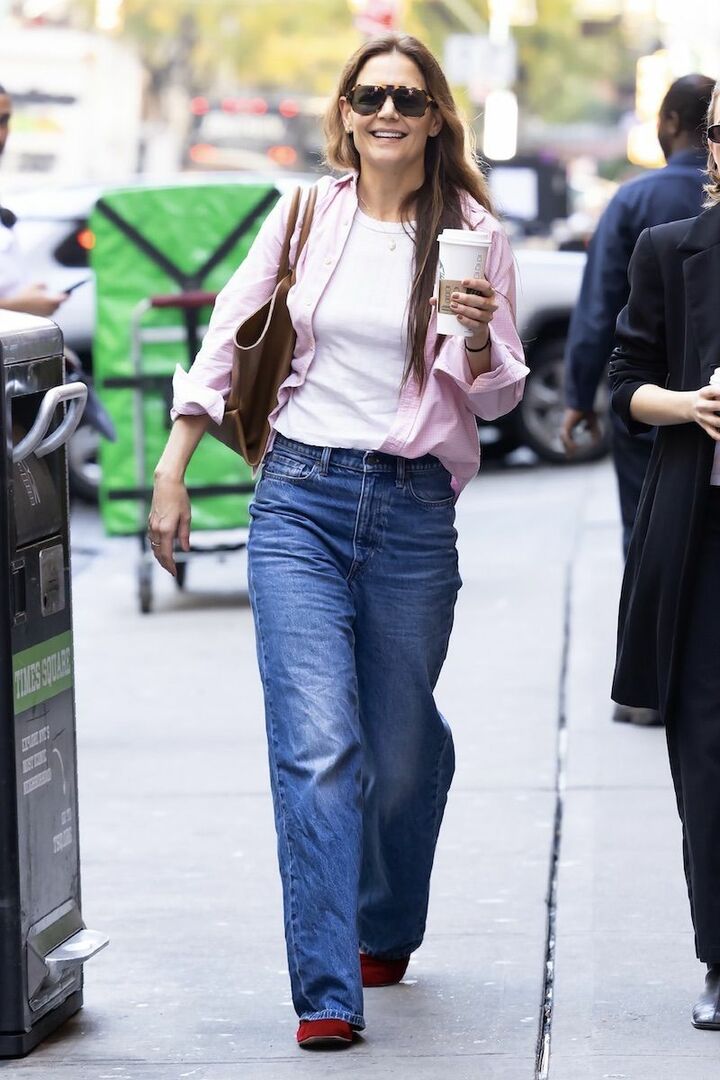 白Tシャツとブルーデニムパンツの王道スタイルに、淡いピンクのシャツと赤パンプスを加えることで、マンネリを脱却したケイティ・ホームズ。カラーを盛り込んでもトゥーマッチにならないのは、カジュアルをベースにしつつ、中間色であるブラウンバッグを調整役として取り入れているから。
