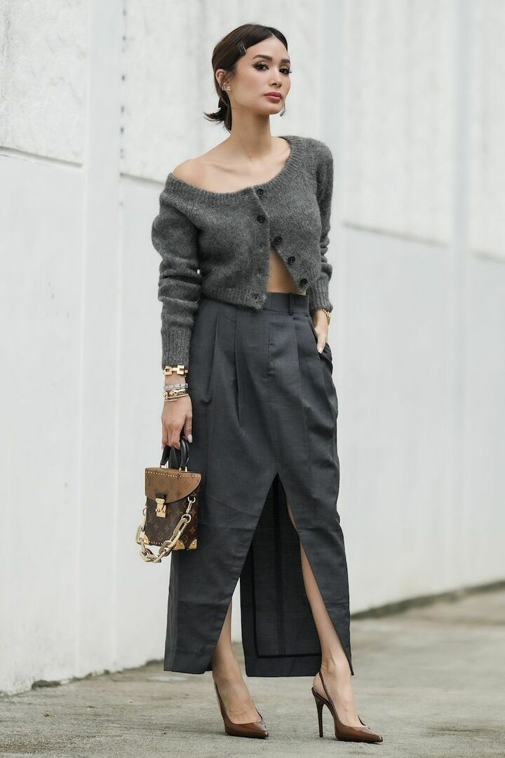 ショート丈のニットカーディガンとIラインのスリットスカートを合わせたフェミニンルックは、グレーを繋ぐことでスタイリッシュなムードを両立。バッグとスリングバックパンプスはブラウンを指名し、落ち着いた色合わせにするとぐっと大人顔。