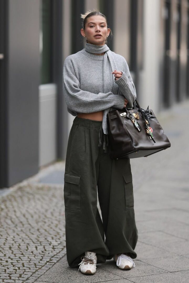 イージーカーゴパンツとスニーカーを組み合わせたストリートスタイルは、深みのあるグリーンとライトグレーの配色でスタイリッシュさを両立。こっくりとしたダークブラウンのレザーバッグで緊張感をもたせ、大人らしく誘導。