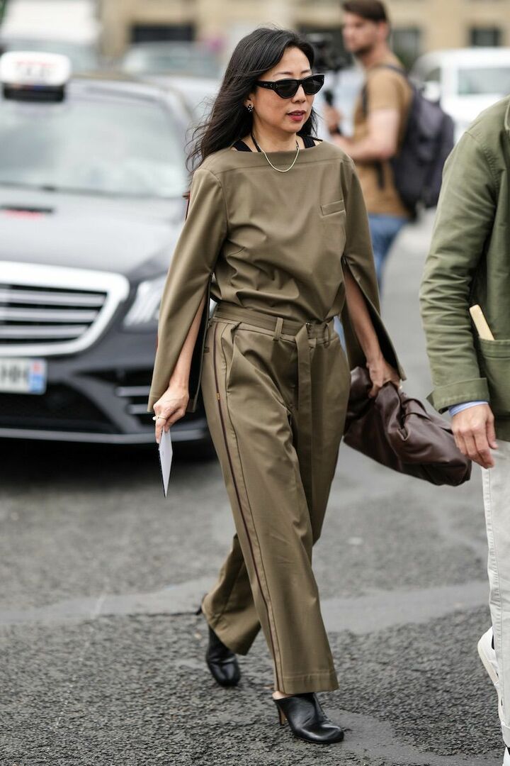 ボートネックやスリットスリーブがアクセントのトップスとパンツのセットアップを使って、時短で着映え力の高さを確保。格好よいカーキスタイルには、ブラウンのバッグがお似合いです。さっとラフに抱え持ちすると小粋なムードが漂って。