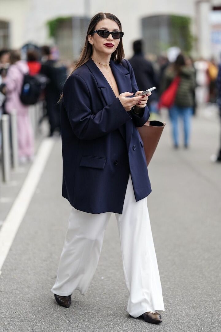 ゆったりシルエットが今っぽいジャケットとパンツのワンツースタイルは、ネイビーと真っ白の色合わせで清潔感を手に入れて。優しい引き締め力があるブラウンのバッグは、ジャケットのシルエットにマッチするようビッグサイズを指名。首元とデコルテを美しく飾る、ゴールドのチェーンネックレスにも注目。