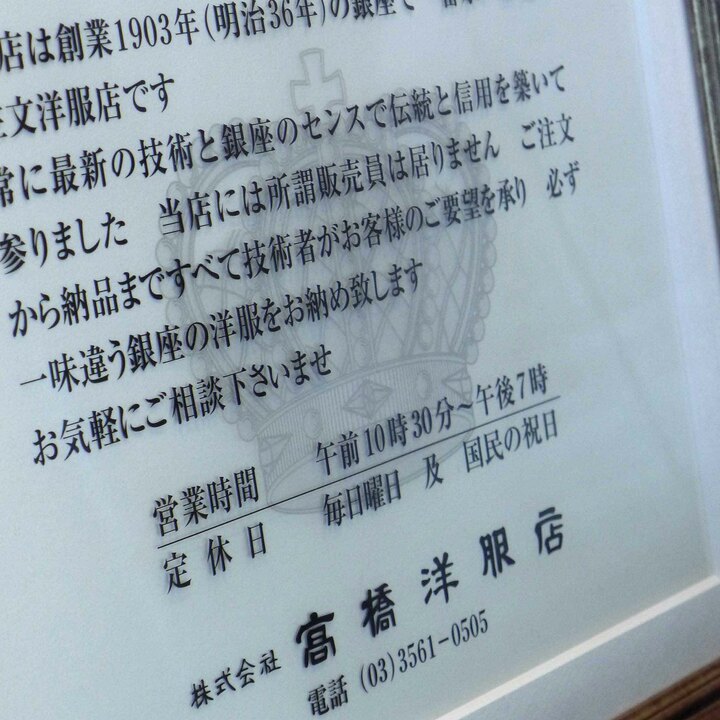 創業1903年の「髙橋洋服店」は、銀座最古の歴史を誇る仕立て服店である。明治の頃から現在も、多くの名士たちの服を仕立て、当人たちを唸らせてきている。名を連ねればキリがないが、内務大臣や帝都復興院総裁などを務めた後藤新平、ノーベル文学賞を受賞した川端康成といった粋人たちが愛した名店だ。