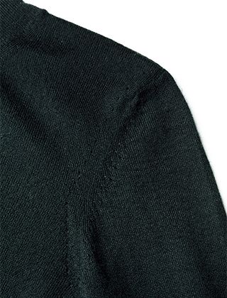 例えば、パーツ同士の縫い付けはもちろんのこと、ネームタグや品質表示のタグにいたるまで、熟練の技をもつ職人による手作業で仕上げられています。それにより素肌に一枚で着たときの快適さと美しさが両立しているニットに仕上がるのです。