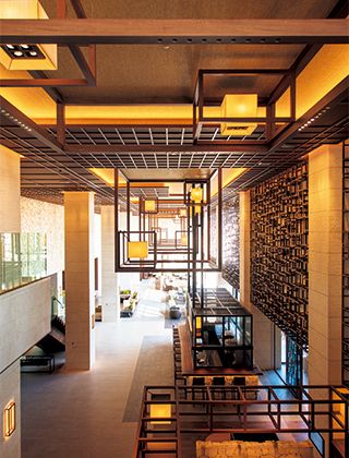 建築デザイナー橋本夕紀夫氏が手がけたロビーエリアは、壮大な吹き抜けと、高さ約8mの天井から下がる格子が印象的。壁面には琉球石灰岩が取り入れられています。