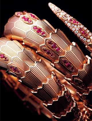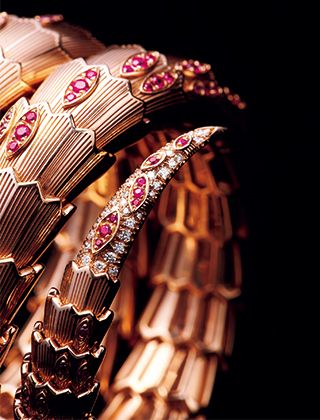 「セルペンティ」=「蛇」というブルガリを象徴するアイコニックなモチーフのデザイン性。立体的なフォルムの細部にまで、さまざまな大きさのダイヤモンドやルビーを丹念にセッティングする熟練の職人技。そして厳選された最高品質の宝石たちによって実現した美と迫力。