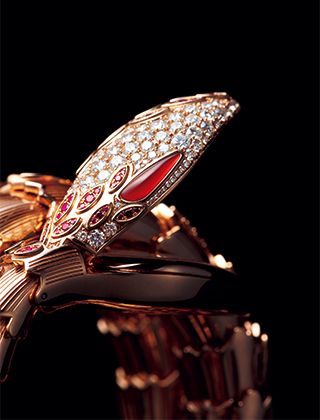 蛇の目にはカーネリアンが施され、妖艶な表情を醸し出す。ケースには110個(~2.3カラット)のダイヤモンドと、48個のルビーをセッティング。