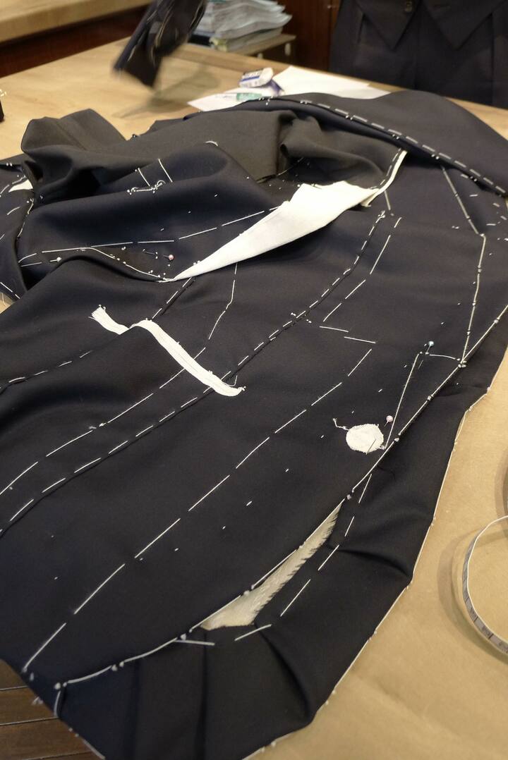 仮縫いでは、白い布地を使ってボタンやポケットの位置を示す。中縫いはなく、1度の仮縫いで仕立て上げるのが、銀座名店の流儀である。