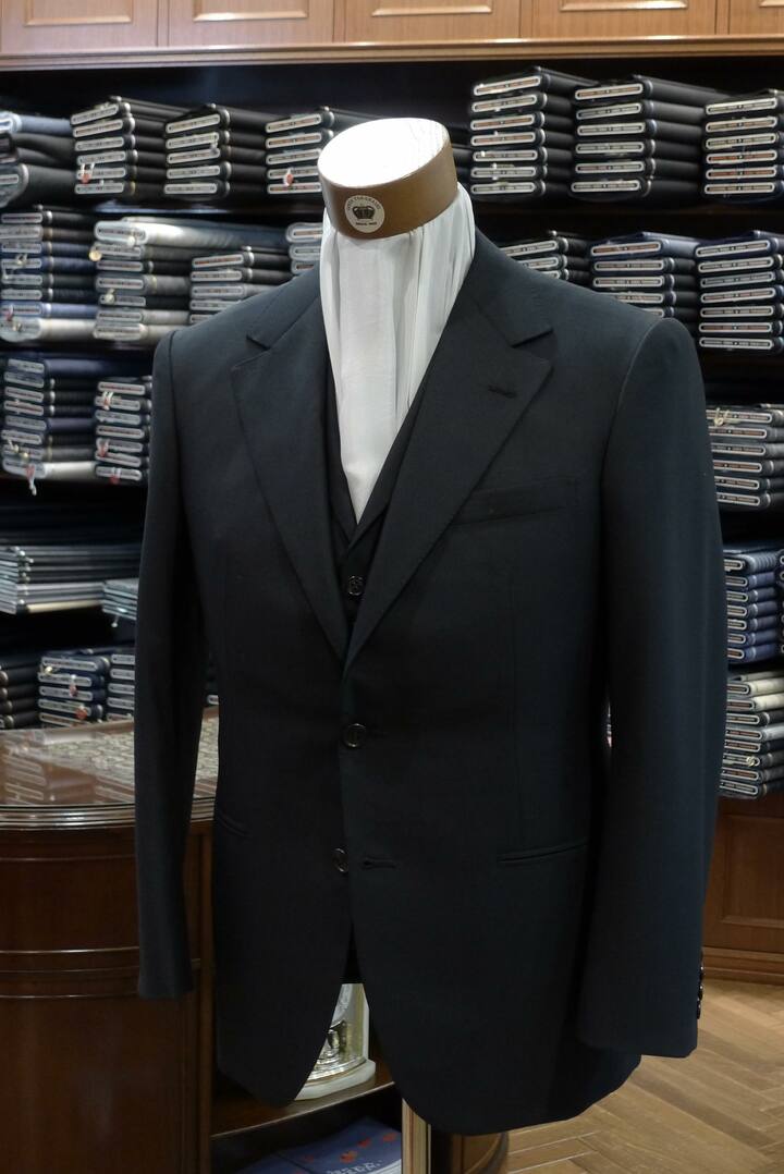 最も薄いタイプの肩パッドを使った肩は、直線的なラインを描いているが、自然になじんでくるやわらかさがある。胸元に目を移せば、セミノッチドラペルは、時代を超越した普遍的なバランスを備える。ヴェストのデザインが個性的だ。往年の「キルガーフレンチ&スタンバリー」を彷彿させる、ふたつずつボタンを近づけたデザインや、すそを鋭角的に仕上げた前身頃にエレガンスが宿る。ストンと下に落ちるシャープなシルエットのパンツは、ツープリーツですそ幅19,5cm。スーツの着心地を通して安心感も伝わってくるのは、実に珍しい体感である。