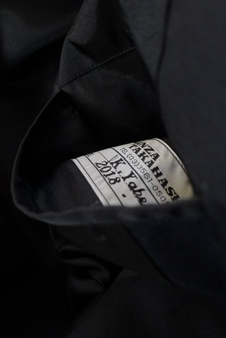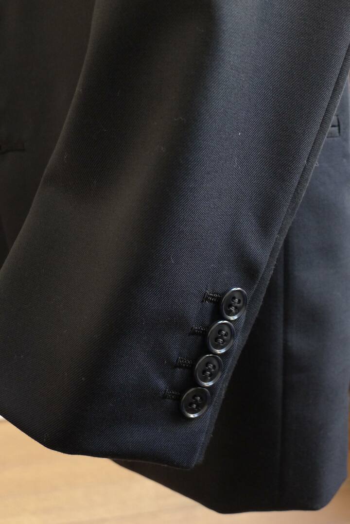 そで付けは、鎌深の浅い(アームホールの小さい)仕立てである。腕を上げ下ろししても、決してジャケットの身頃がひっぱられることはない。可動域の広い、心地のいいフィット感がすでに備わっていた。そのとき、純氏は“髙橋流”そでつけの奥義を語った。「通常のスーツと礼服とでは、そで付けを若干変えています。礼服は、直立した“気を付け”の姿勢をより美しく見せるために、普段に着るスーツでは、前かがみで仕事をすることが多いため、より快適な動作ができるように」と。そで付けひとつとっても、長年の仕事で培ってきた、服づくりの細かい技が生かされているのである。