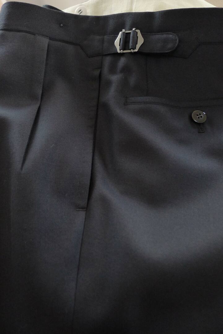 仮縫いは、まずパンツをはく。純氏が丁寧にウエスト周りを合わせる。以前、「若い世代は、“ローライズ”というカジュアルな着こなしで、ドレスのパンツでも随分と下げてはくようですが、腰骨の上にウエストラインが載るように位置づけます」と純氏が言っていたことを思い出した。股上を深くしたパンツで、ブレーシズを付けてはく場合は、腰骨よりも少し上の位置にウエストラインを合わせるそうだ。