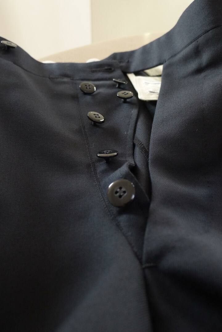 パンツはボタンフロント仕様。ウエスト周りをしっかりとホールドする、パンチェリーナもデザインする。一つひとつのボタンは、留めやすいように十分に「根巻き」されている。