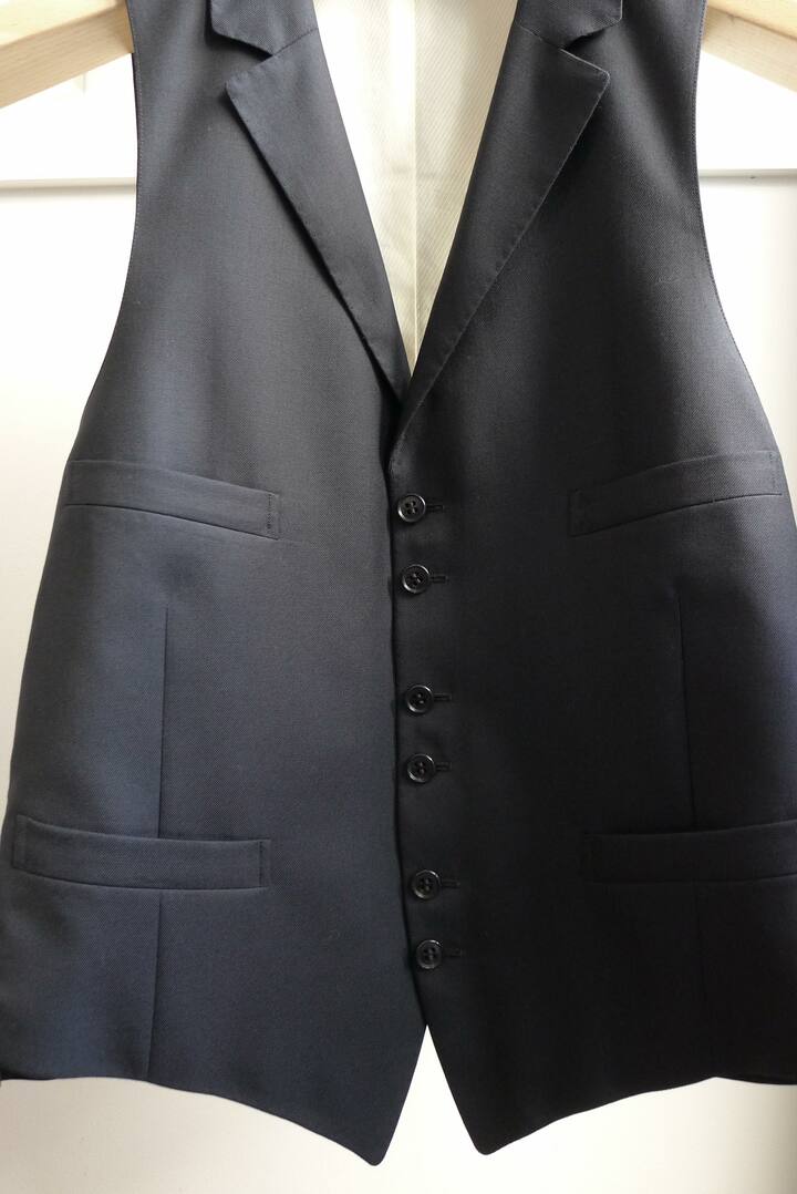 特殊な設定によるヴェストを選んだ。フロントは6つのボタンを配したシングルタイプだが、そのボタンの位置が往年の「キルガーフレンチ&スタンバリー」のデザインを思わせる。