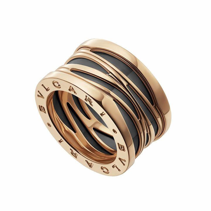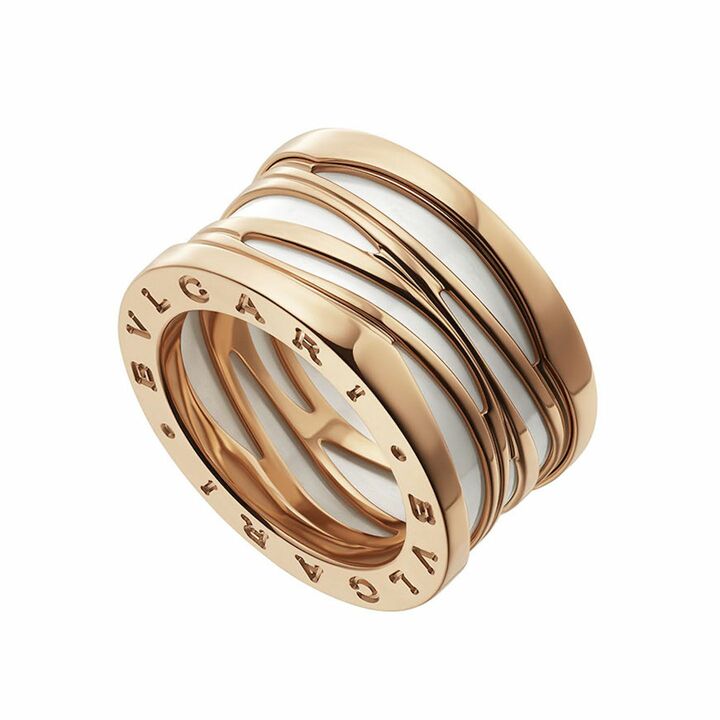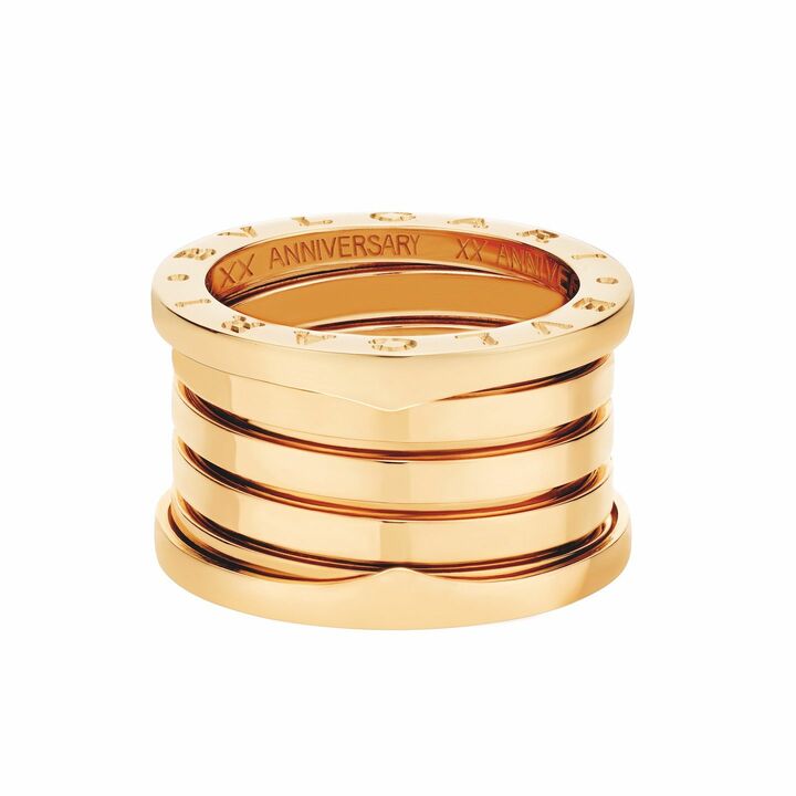 このアイコニックな「ビー・ゼロワン」のスパイラルは、常にゴールドのリボンから始まります。メゾン独自のトゥボガス技法により、はんだ付けを使用せずに、細長いストリップを巻き付けて交差させ、最後に「ブルガリ・ブルガリ」のロゴを刻印したフラットなリングで挟み込んで仕上げます。