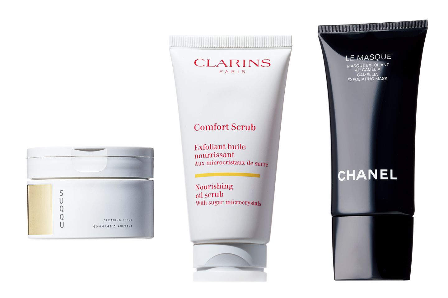 左から/SUQQU クリアリング スクラブ 100g ¥4,950、クラランス コンフォート オイル スクラブ 50ml ¥4,950、シャネル ル マスク エクスフォリアン 150ml ¥10,120