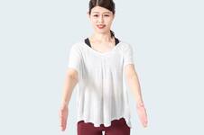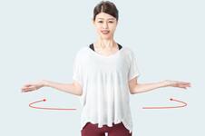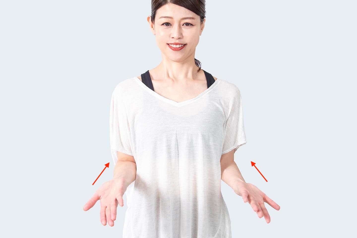 手と腕を引いたまま、肘を軸にして、左右の外側に開きましょう。このとき左右の肩甲骨が中心に寄り、二の腕の筋肉がストレッチされるのを実感するはず。これを20秒キープ。これを3回繰り返してください。