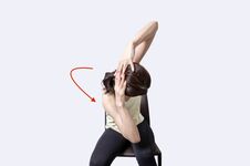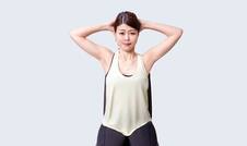 イスに座り、足を腰幅に開きます。そして頭の後ろで両手を重ね、肘をできるだけ後ろに引いて、胸を開きましょう。これが基本姿勢です。反り腰にならないように下腹を軽く凹ませましょう。
