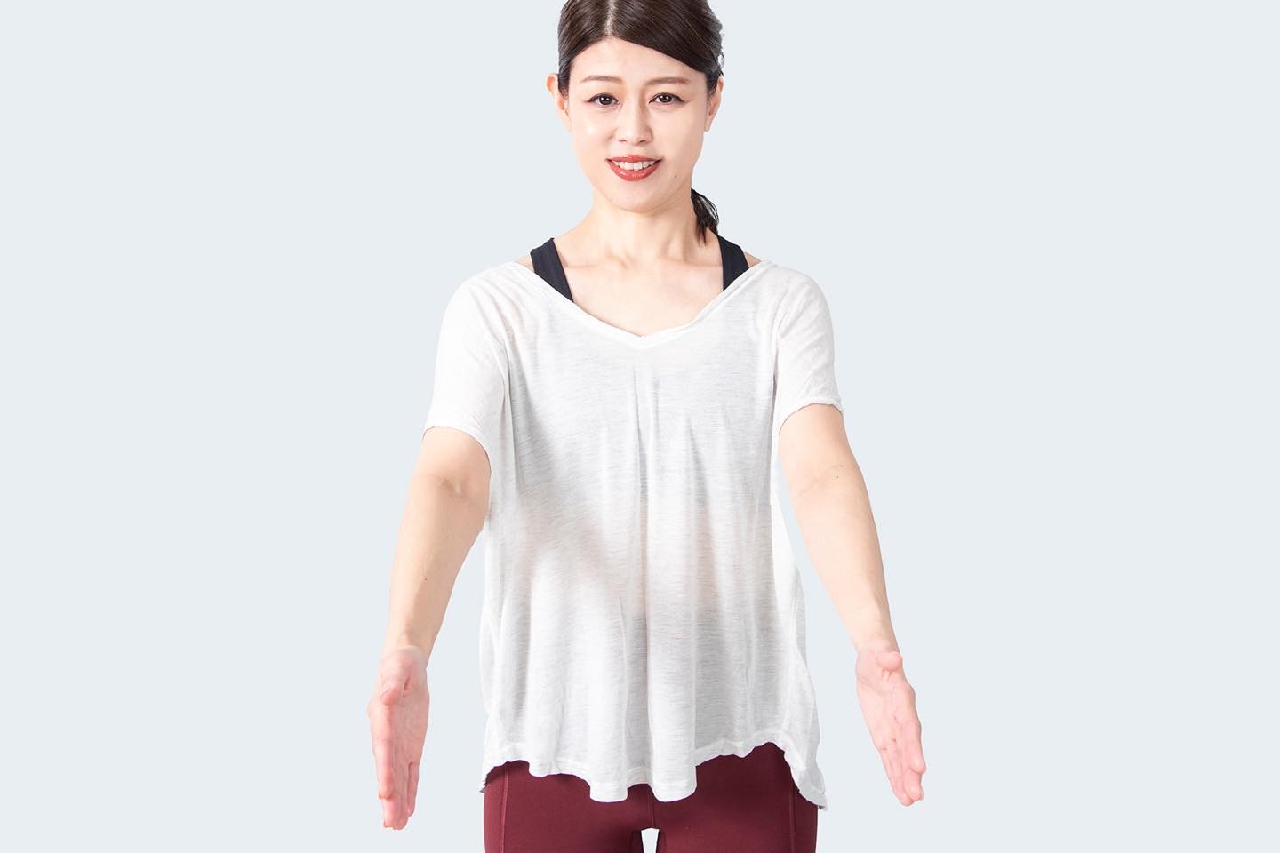 腕を伸ばして手を前に出します。肩が上がらない高さをキープしてください。