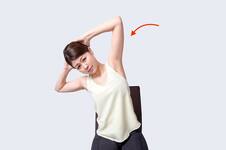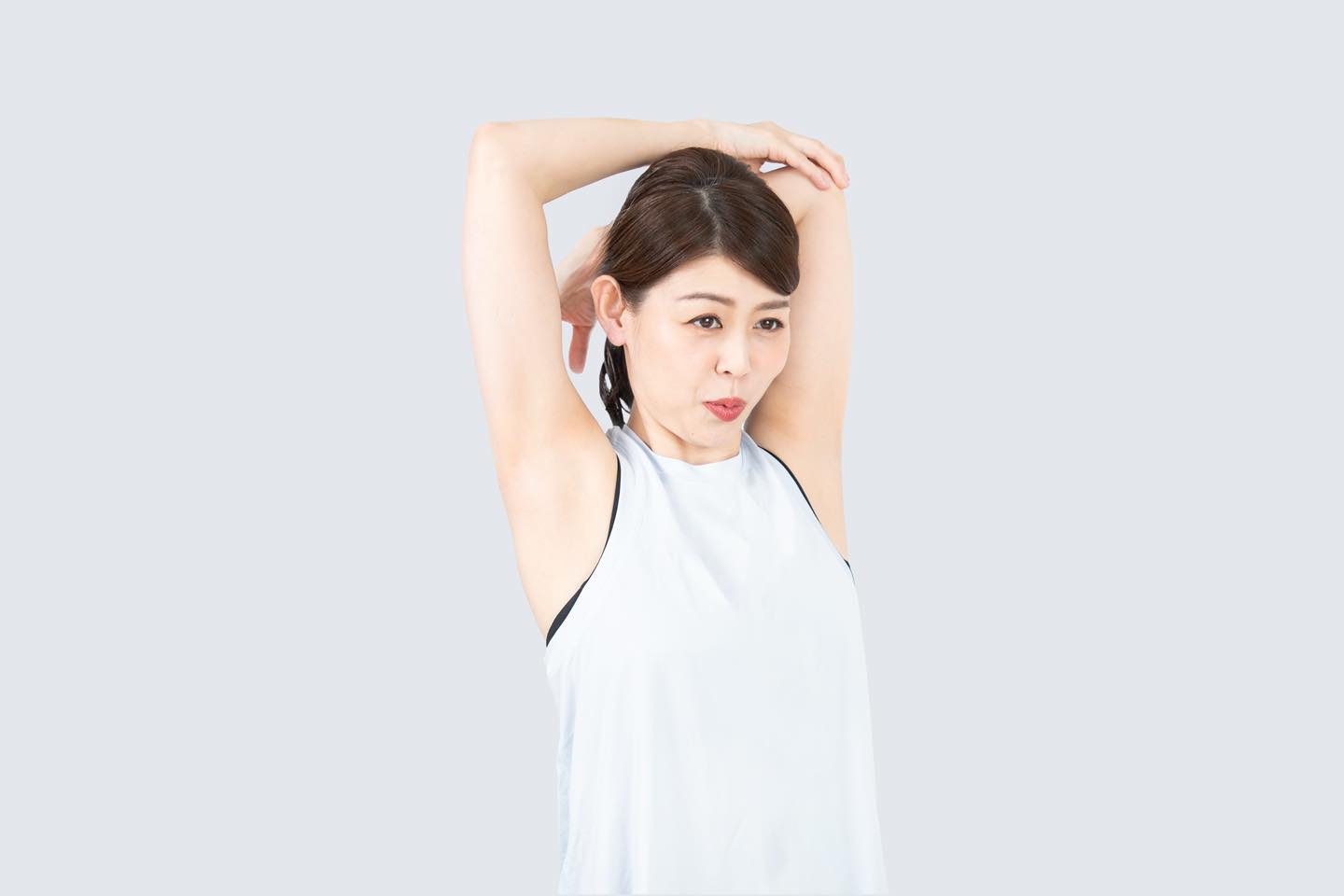 左腕を上げてから肘を曲げ、右手で左肘をつかみ、上腕三頭筋を伸ばすようにストレッチを。深呼吸しながら10秒間行いましょう。 右腕も同様に、STEP1〜4を行いましょう。