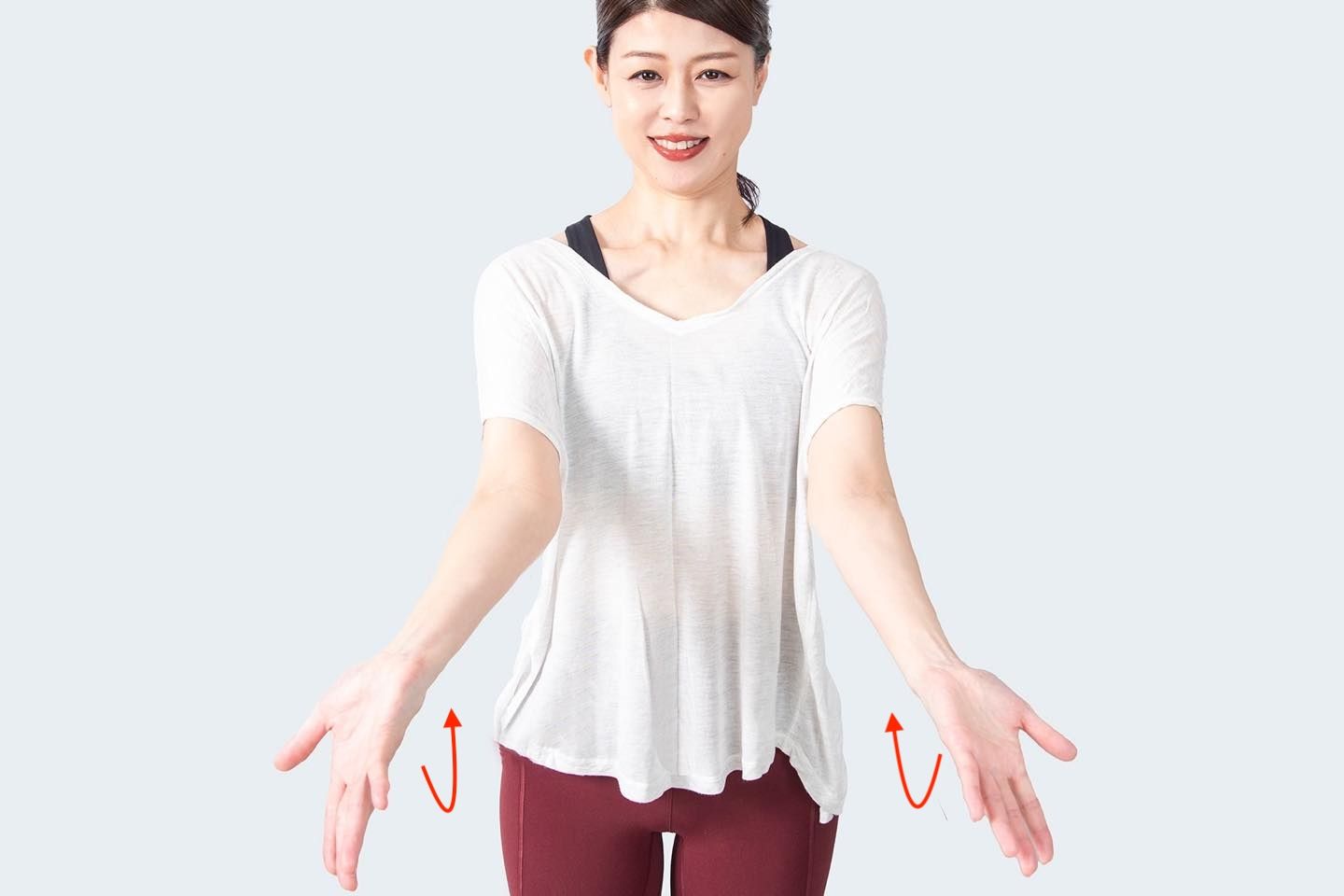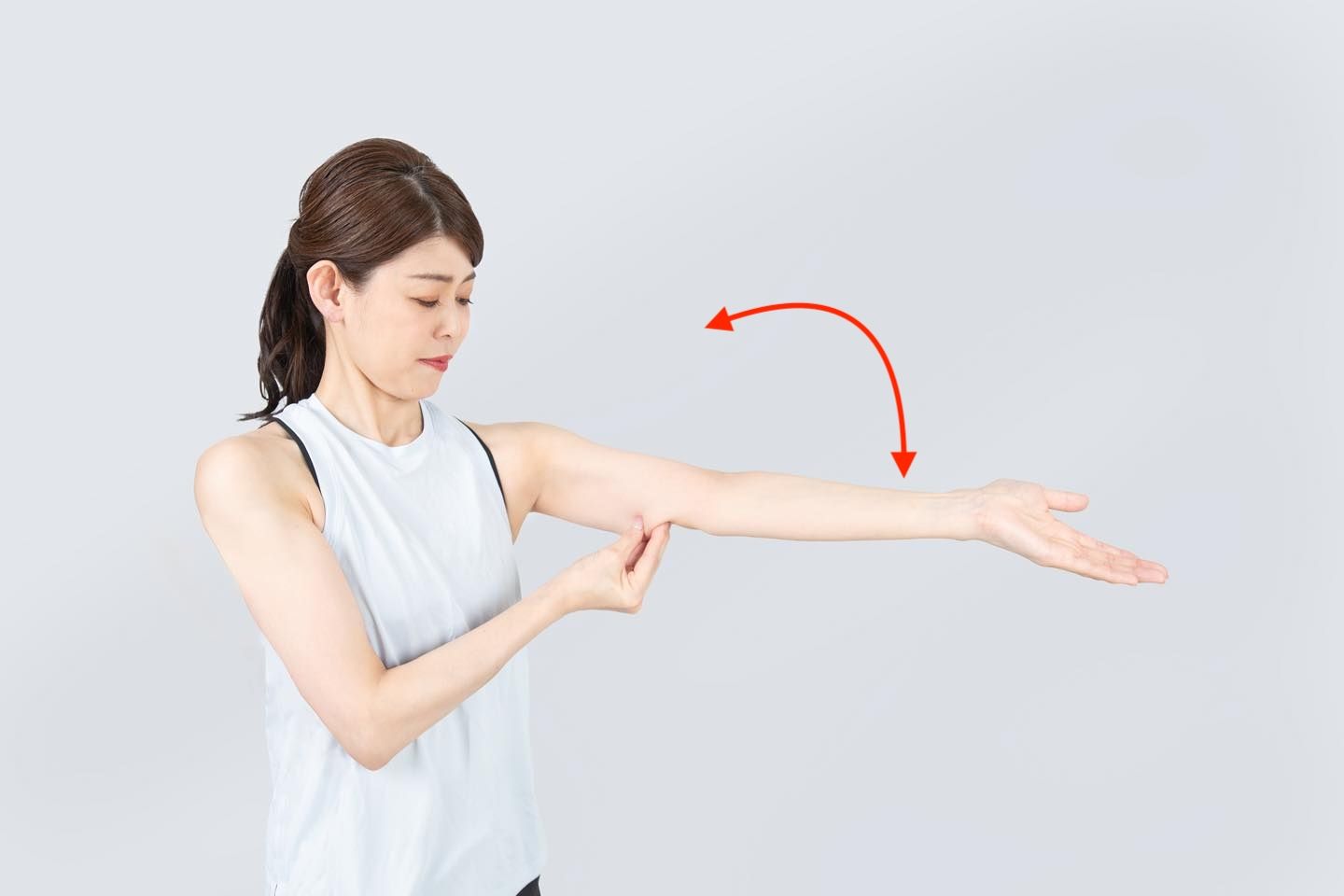 腕を内側に回転させて、小指側を上げるように意識します。このとき手首を回転させるのではなく、腕全体で回転させるように行いましょう。