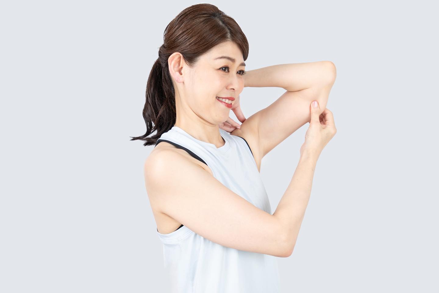 上腕の裏側にある「上腕三頭筋」をほぐしやすいように、左手を左の肩に置いて、左肘を上げます。