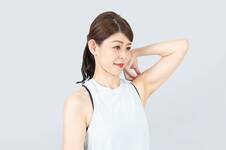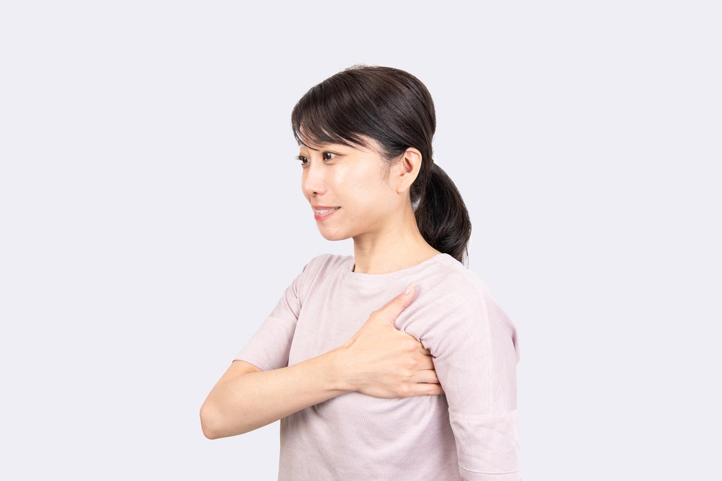 親指以外の4本の指を脇の下に差し込むように入れます。親指は鎖骨下の小胸筋に当てましょう。人さし指、中指、薬指の3本の指を肋骨方向に押しながら、脇の下の筋肉をぎゅっとつかんでください。
